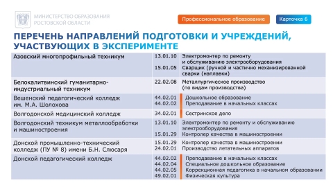 Пилотный проект по расширению доступности среднего профессионального образования (СПО) в Российской Федерации стартовал в 2025 году. В 2026 году в этот проект включены дополнительные территории, среди которых и Ростовская область. Проект предусматривает упрощение процедуры поступления в некоторые учреждения СПО и направления подготовки, перечни которых утверждены министерством образования Ростовской области.