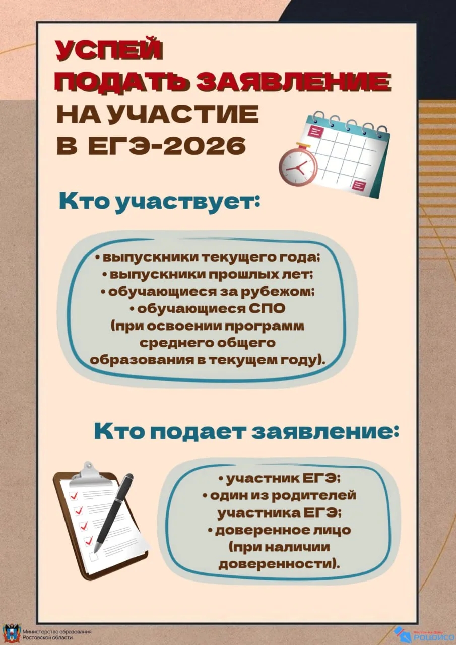 ✏️ Рособрнадзор напоминает: заявление об участии в ЕГЭ-2026 нужно подать до 1 февраля. Поскольку 1 февраля – воскресенье, срок подачи заявления продлевается до 2 февраля включительно.